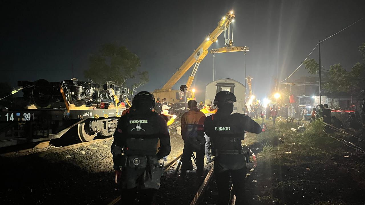 Personel Brimob tiba di lokasi sekitar pukul 20.15 WIB dan langsung berkoordinasi dengan pihak PT Kereta Api Indonesia (KAI), kepolisian setempat, serta instansi terkait lainnya. Mereka kemudian melakukan pengaturan arus lalu lintas di sekitar lintasan yang terdampak akibat dua gerbong bagian belakang kereta yang anjlok.
