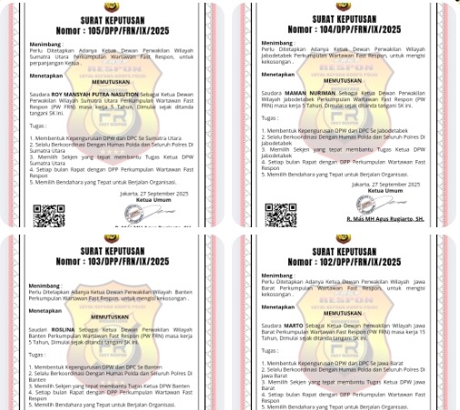 Dengan penetapan empat ketua DPW tersebut, FRN Counter Polri kini berada pada posisi yang lebih kokoh dan terorganisir, siap menghadapi tantangan dan menjalankan program kerja secara lebih konsisten. SK untuk daerah lain masih menunggu pengumuman resmi selanjutnya.