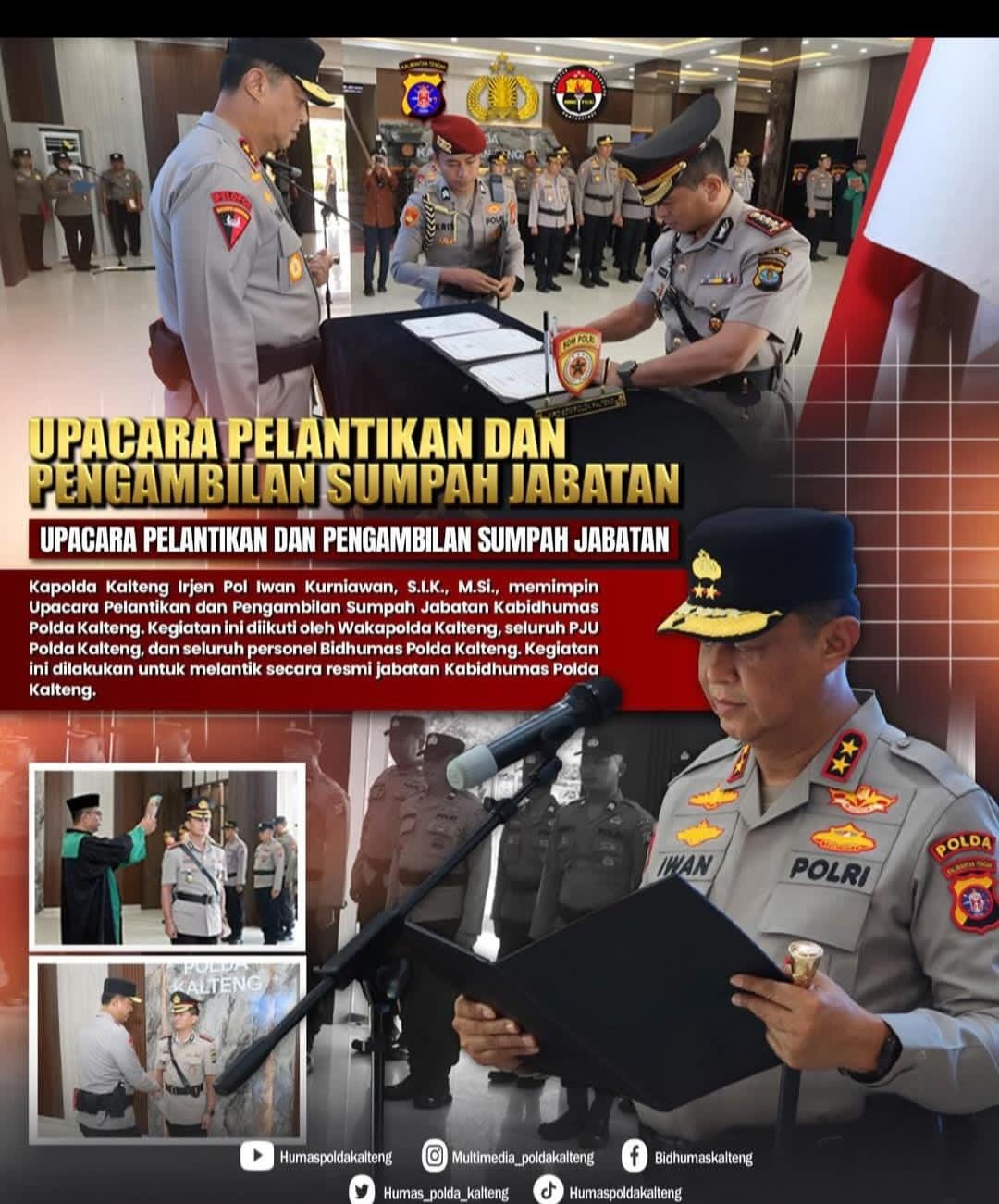 Pelantikan dan pengambilan sumpah jabatan Kabidhumas tersebut, dipimpin langsung Kapolda Kalteng Irjen Pol Iwan Kurniawan, S.IK., M.Si. dan dihadiri Wakapolda Brigjen Pol Drs. Yosi Muhamartha, para pejabat utama dan personel Bidhumas Polda Kalteng.