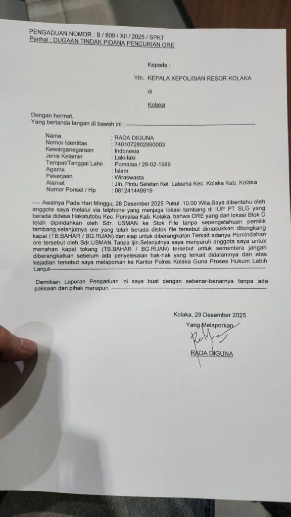 kpkmsultra.com-Kolaka – Penegakan hukum di wilayah tambang Kabupaten Kolaka kembali dipertanyakan. Dugaan pencurian atau penggelapan ore nikel di dalam wilayah IUP PT SLG, Desa Hakatutobu, Kecamatan Pomalaa, justru berujung pada pemandangan memalukan: laporan polisi resmi terbit, tetapi barang bukti malah dilepas berlayar.